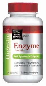 Total Health's Enzyme Support Formula combines 20 different enzymes specifically designed to help digest fats, carbs, sugars, dairy and plant fiber. In addition, one Billion probiotic cultures "friendly bacteria" and Trace Minerals are added to complete this powerful formula.